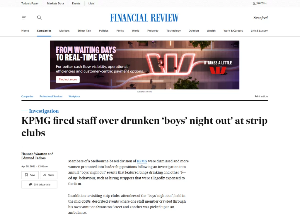 Consider these two headlines, published four years apart: one from 2021, where KPMG fired staff over a โboysโ night outโ at strip clubs, and another from just days ago (20 August 2025), where JLLโs Australia boss was accused of being blind to misogyny even after a mass walkout.