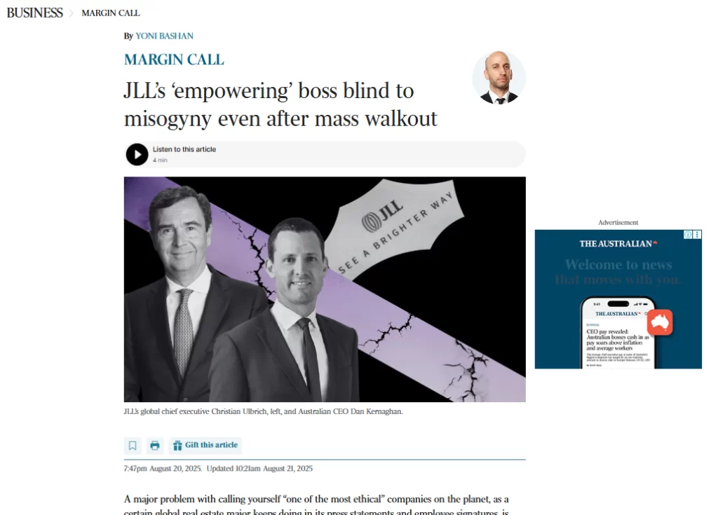 As reported by The Australian, JLLโs local CEO was sacked the following week but the juxtaposition remains telling: two sectors moving at very different speeds on cultural reform.